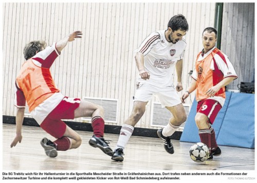 Sechs Mannschaften spielten im Modus "jeden gegen jeden" gegeneinander. Die etwa 100 Zuschauer sahen insgesamt 15 Spiele und 53 Treffer. Im Vordergrund bei dem von den Fußballern in Eigenregie organisiertem Turnier stand in erster Line der Spaß am Hallenfußball. Den hatten sicher auch die fünf Spieler mit jeweils vier Turniertreffern, die um die Torjägerkrone im Stechen stritten. Dieses Quartett musste zum Duell vom Neun-Meter-Punkt antreten. Hier zeigte schließlich Daniel Richter (VfB Gräfenhainichen), dass er die besten Nerven hatte. Auf Grund der guten Resonanz beabsichtigt die SG Trebitz auch im nächsten Jahr ein Hallenturnier zu organisieren und auszurichten. Die weiteren Plätze belegten SG Zschornewitz/Muldenstein, Germania Wartenburg, SG 1919 Trebitz und FSV Rot-Weiß Bad Schmiedeberg.