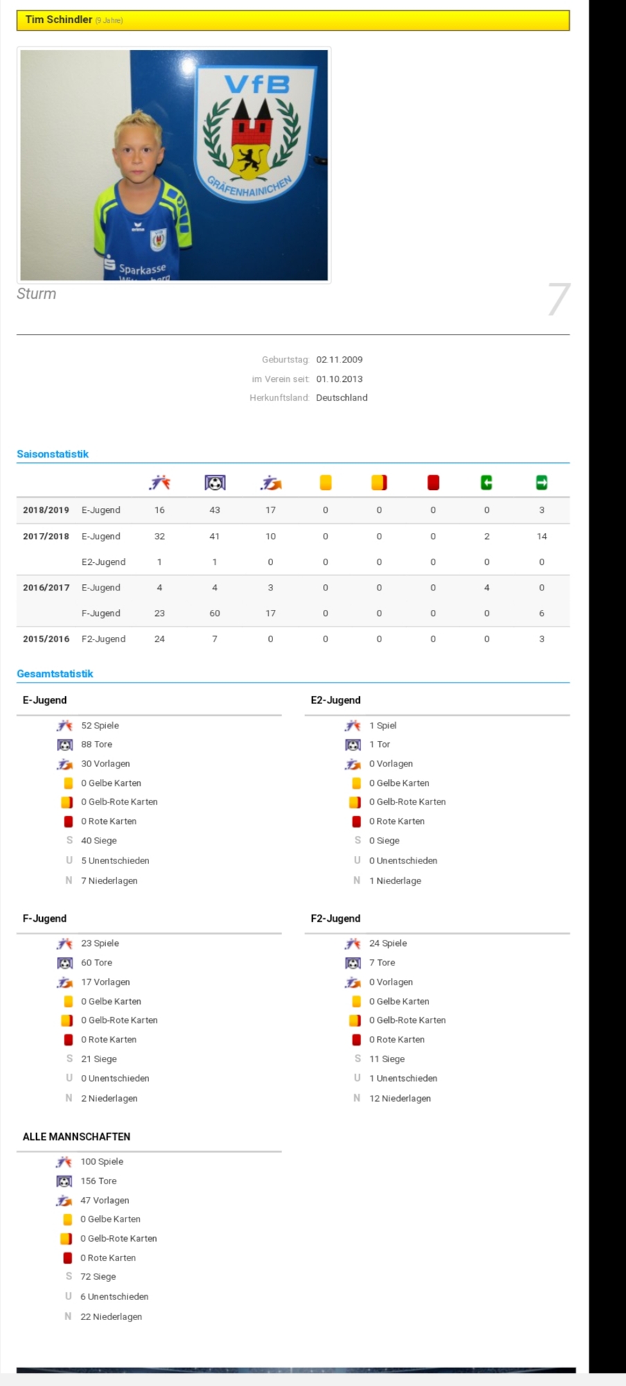 Seit dem 01.10.2013 ist unsere "Jüngster" Tim Schindler im Alter von 3 Jahren,11 Monaten im Verein des VfB Gräfenhainichen Mitglied. Seit diesem Tag hat er nunmehr heute sein 100. Pflichtspiel im Trikot der "Blau-Gelben" absolviert. Dabei schoss er 156 Tore und gab 47 Vorlagen für seine Mitspieler. Angefangen hat er als Abwehrspieler, bis er in den Sturm wechselte und dort sehr treffsicher ist. Dies bewies er auch heute, in seinem Jubiläumsspiel, wo er 4 Treffer erzielte.