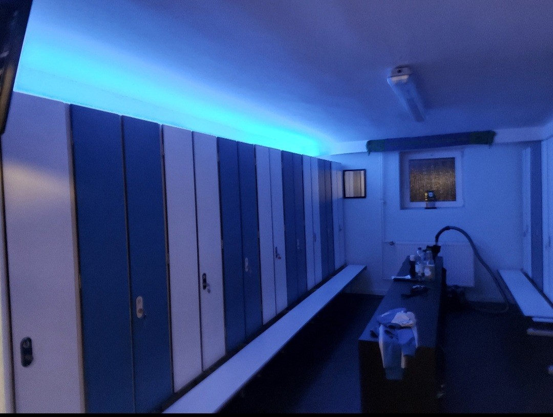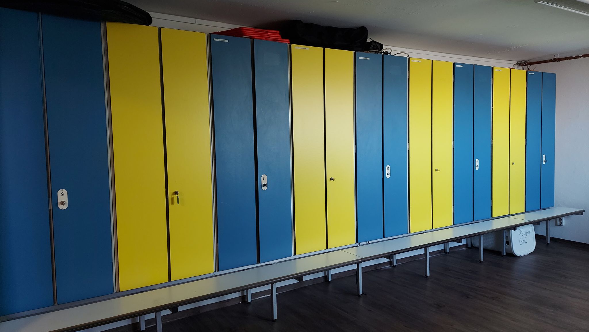 Im Trainerraum wurde neuer Fußboden verlegt, die Wände gestrichen und neu eingerichtet. So haben tolle Spinde einzig gehalten. Die weißen Schränke wurden gelb beklebt, sodass unsere Vereinsfarben den Raum super schmücken. Schon mal vielen Dank an Jutta Boas!