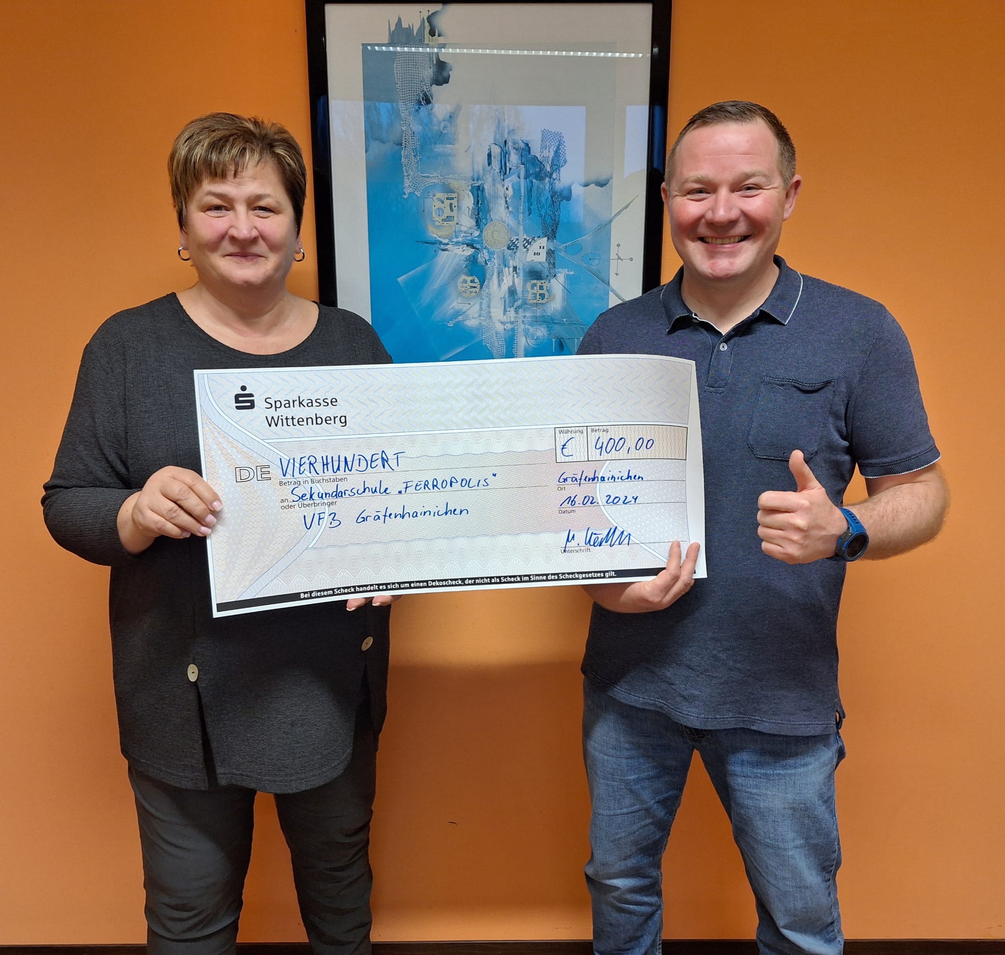 Unser Vorstandsmitglied Marc Körsten, der als Mitorganisator des Turniers fungierte, machte sich mit der freudigen Botschaft auf und überreichte den Scheck der Rektorin, Frau Röhner.