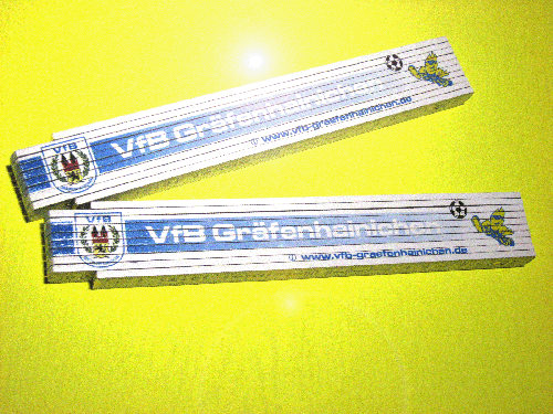 Mit dem Haushaltsplan 2009 wurde schon angekündigt: ... Verkauf von VfB-Fanartikeln. Nun ist es soweit - der erste VfB-Zollstock wurde kreiert und wartet auf neue Besitzer, die ihren Verein unterstützen wollen. Der Verkauf startet am 22.03.2009 zum Heimspiel gegen Oranienbaum auf dem Gräfenhainicher Sportplatz in der Sprecherkabine.